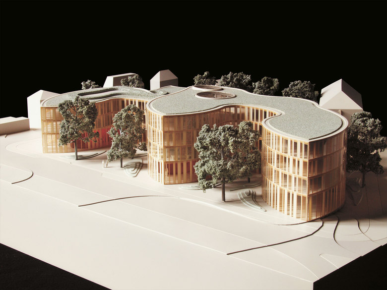 Das gesamte Gebilde scheint sich von Westen nach Osten zu bewegen. Dieser Eindruck rührt daraus, dass alle 3 Flügel im Westen eine stumpfe, 2 Geschosse hohe, im Osten aber eine spitze, 3 bis 4 Geschosse hohe Seite haben. Die Bewegung findet mit den Spitzen der Flügel einen Abschluss, welcher die Grenze zwischen den jüngeren westlichen und älteren östlichen Stadtteilen markiert. Nachdrücklich würdigen die beiden Flügel im Norden – nicht allein mit ihrer Spitze, sondern auch mit ihrer Steigung auf 4 statt 3 Geschosse – die Bedeutung des aus dem 15. Jahrhunderet stammenden Gemalten Turmes an der noch erkennbaren Befestigung der Stadt.