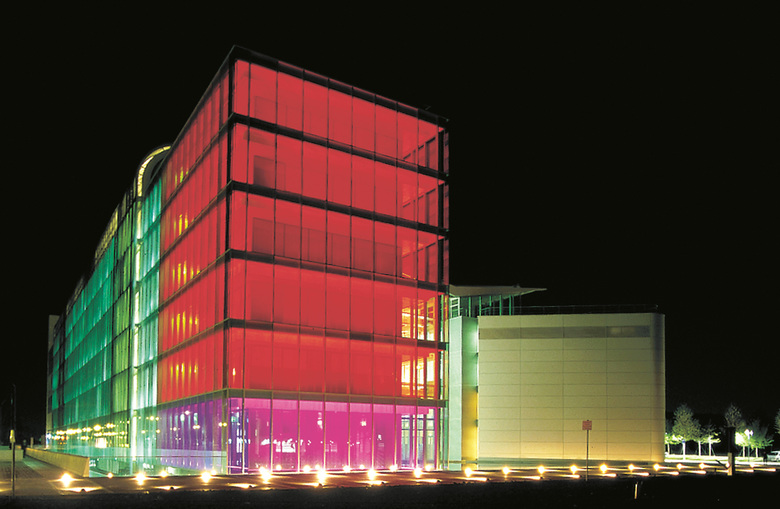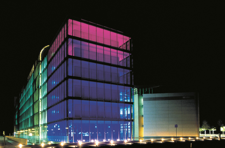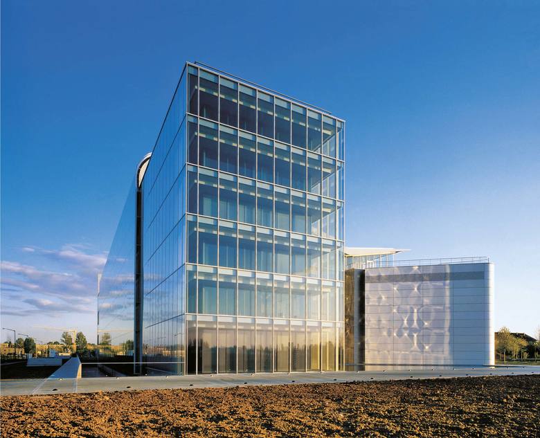 Das Verwaltungsgebäude und das Rechenzentrum als die Hauptteile des Raumprogramms sind nicht allein organisatorisch, sondern auch energetisch, das heißt in Bezug auf Heizung und Kühlung, miteinander verbunden. Die für das Rechenzentrum benötigte Energie wird vor Ort durch mehrere Blockheizkraftwerke produziert. Bei der Formgebung des Gebäudes spielte die Thermik des Atriums eine große Rolle; der Luftstrom wird sommers für die Auskühlung, winters für die Erwärmung genutzt. Barocke Synästhesie, Auflösung der Erscheinung des Stofflichen, Einheit von Kunst und Bau: Auf diese Wünsche der Architekten ließ sich James Turrell mit seinem Lichtkunstwerk ein. An der Nordseite des Gebäudes tritt ein Rechtkant mit drei Seiten aus einem der beiden Riegel. Dieser Bauteil dient Konferenzen. In die Außenkanten der Geschossdecken sind Neonröhren integriert. Digital programmiert, können sie die Lichtfarbe allmählich verändern und den Kubus in sehr differente Atmosphären tauchen.