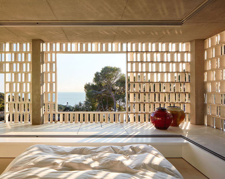 Entirely glazed, the south-facing rooms on the upper floor are shielded from the sun and provide a filter for the views via a delicate glazed lattice of ceramic that is separate from the glass frames.