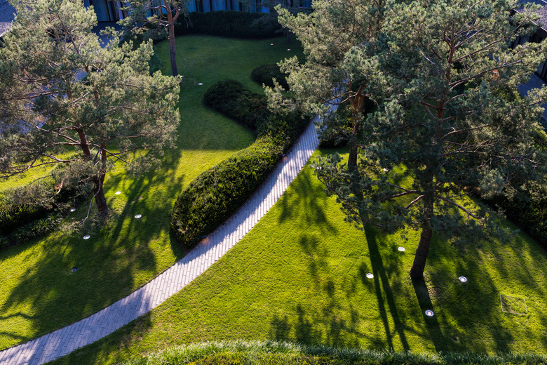 Auf der Südseite ist der direkte Kontakt zur Alpenwiese gegeben, welche auch an den bestehenden Schwarzkiefern bis hin zum Schattenbereich auf der Ostseite verläuft. Im Schatten und Halbschatten werden Grässer wie Calamagrostis bracytricha, Deschampsia cespitosa und für den Schatten Hakonechloa macra und Carex marrowii verwendet.