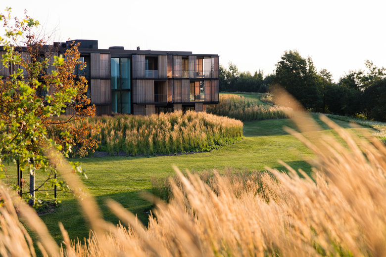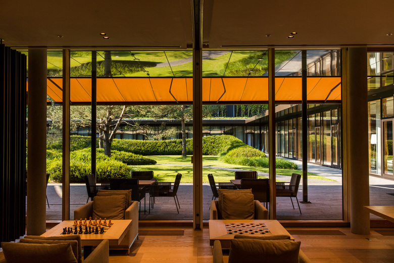 Als Richtlinie zum Entwurf dient die Vorgabe des Architekten, den Neubau in eine natürliche Alpenwiese zu stellen, welche die Architektur umfliesst.
