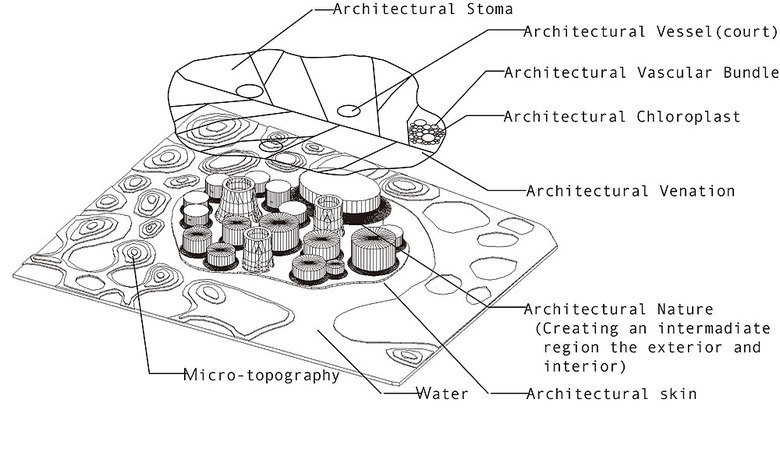 わたしたちの提案には、《建築の植物化》というタイトルを付けました。これからの建築が目指すべき方向性のひとつだと考えたからです。「建築の植物化」とは、形態や構造を含め、植物の有しているさまざまな仕組みやはたらきを建築的考案に変換し、より望ましいソーラー建築のあり方を探ることを意味しています。なぜなら、地上に到達する限られた太陽エネルギーを、最も有効に利用する仕組みを備えているのは、植物だからです。したがって、太陽エネルギーの有効利用を目指すなら、光合成を行なう植物の葉の配列や葉緑素、気孔などのはたらきが、これからの建築のモデルとなるに違いありません。