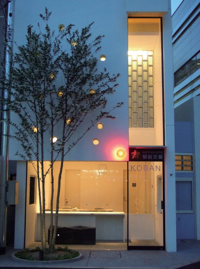 蛍光灯の白い光は冷たく近寄り難い雰囲気を醸し出してしまうため、ここでは、暖かい印象を与える電球色の光を用いました。夜間、交番が周辺に放つ光が、あたかも灯台のようにひとびとに安心感を与える存在になって欲しいと願っています。