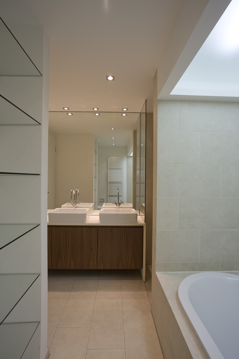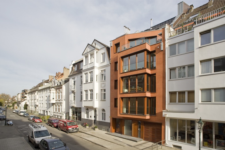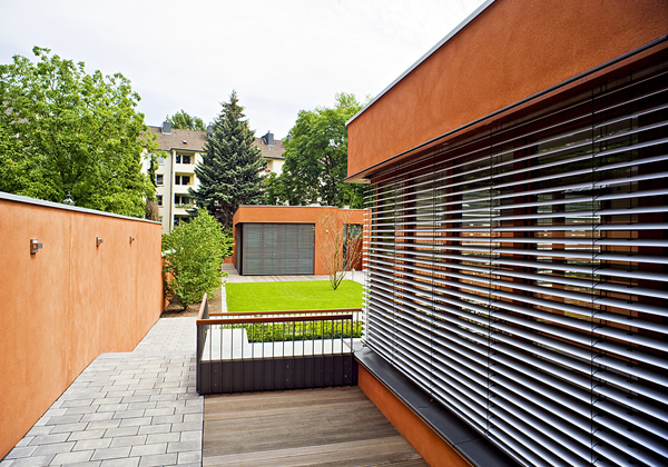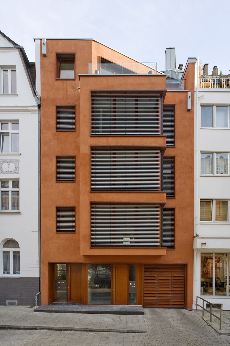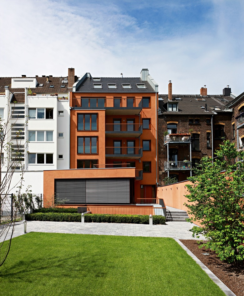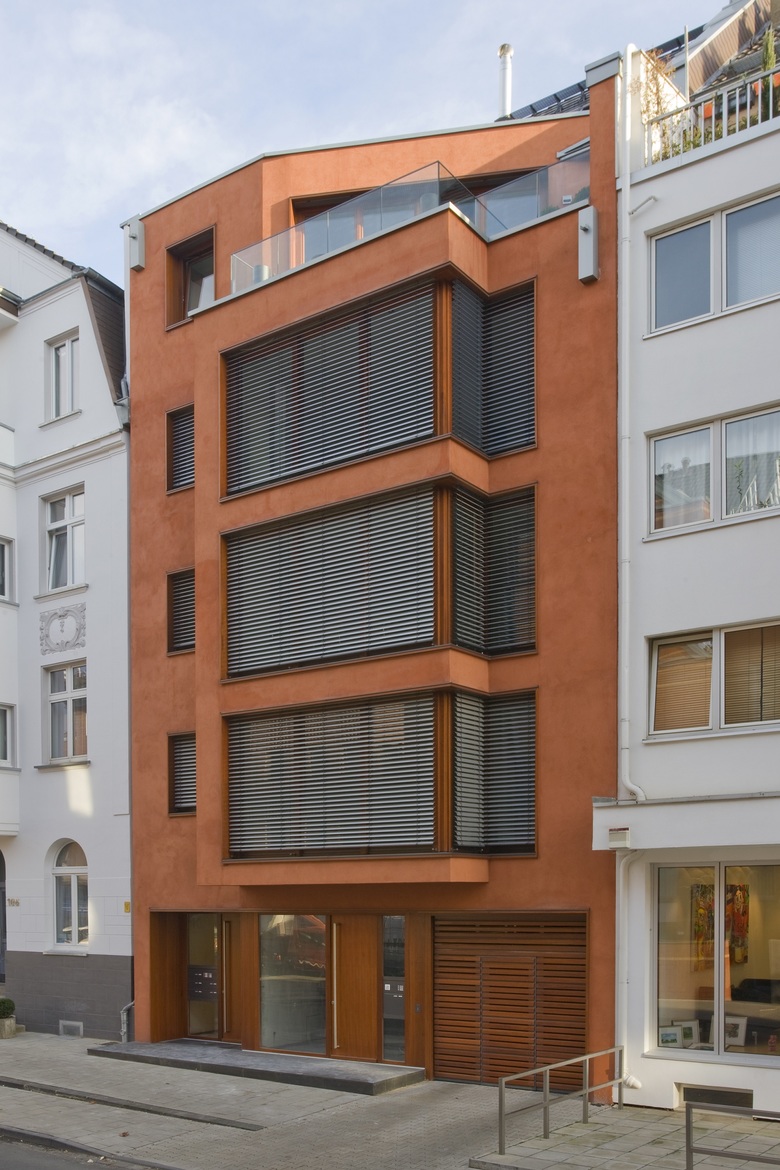 Das Haus besitzt zudem eine sich über die gesamte Grundstückstiefe erstreckende Tiefgarage, die über einen Lichthof zudem Frischluft und natürliches Tageslicht erhält. Besonderheit hierbei ist, dass am hinteren Ende des Baugrundstücks noch Platz für ein Einfamilienhaus gefunden worden ist. Das gesamte Gebäudeensemble wird über die Fassadenausbildung, bestehend aus Geschoss hohen Holzzargenfenstern und einem rostrotem Putz, zu einer Einheit verbunden.