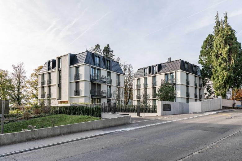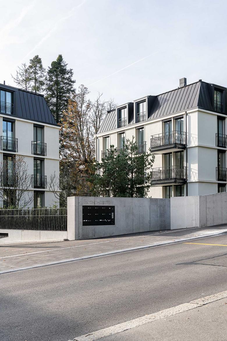 An bevorzugter Lage im beliebten Stadtquartier Dreilinden nehmen die drei neuen Stadtvillen einen ganz speziellen Platz ein. Ihre schlichte und elegante äussere Erscheinung leitet sich von Gestaltungsmerkmalen klassischer Villenbauten ab, interpretiert diese aber auch zeitgenössisch und modern. Auf eine gute Integration der neuen Baukörper ins wertvolle Quartierbild wurde grossen Wert gelegt. So weisen die Häuser beispielsweise erhöhte Sockelgeschosse mit Hochparterre sowie villentypische Mansardendächer auf. Jedes einzelne Geschoss jedes Hauses bietet eine einzigartige, exklusive Wohnsituation mit unterschiedlichen Sichtbezügen in die Stadt, zum See oder zum Konservatorium. Zwischen den drei Stadtvillen sorgt ein üppig angelegter Schaugarten mit Magnolienbäumen für eine stimmungsvolle Atmosphäre.