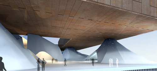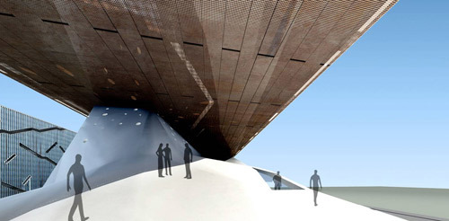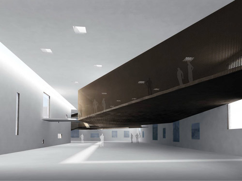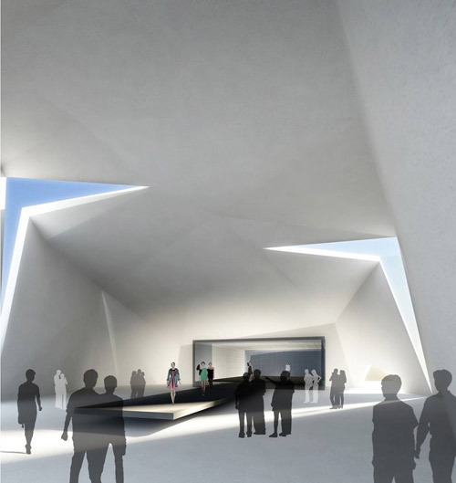 The building is organized based on two sets of L shape volumes. The east wing provides spaces for workshops, the south wing is the staff dormitory. The north-west block is divided vertically into three parts. The base is a space for sales exhibitions. The middle part is a semi-open area with some hill-shaped volumes as multi-function room and caf®¶. This is the place for events like fashion shows and parties. The L-shaped bar, flying at the top part, contains two areas of art exhibitions--- the Museum of Modern Art and the Museum of Fashion which is a floating space embedded in the L-shaped volume. From the entrance level, up to the open platform, "climbing" the hilly- roofs to the museum space, the passage makes a ritual expression for art and fashion.