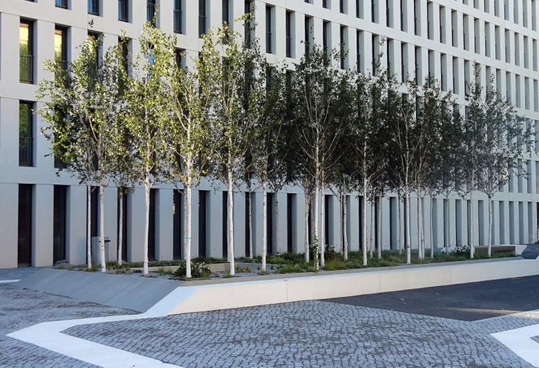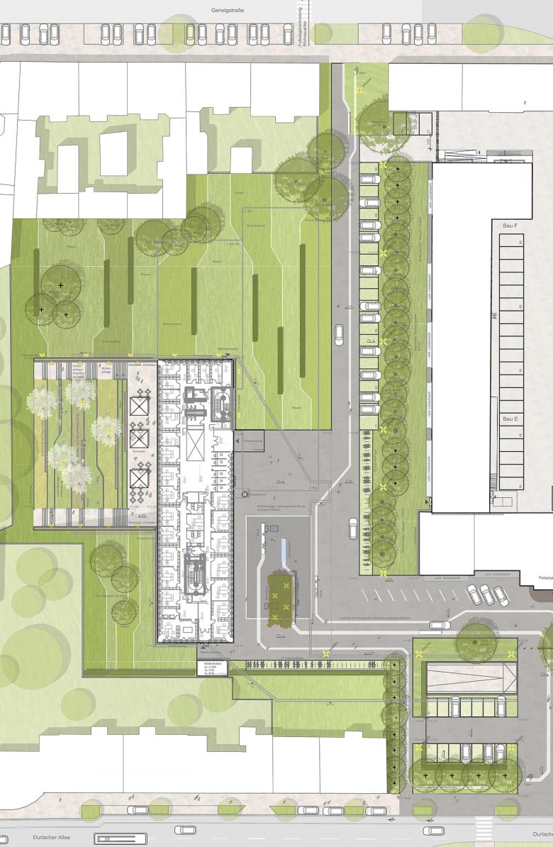 Die Freianlagen des Neubaus des Finanzamtes Karlsruhe Stadt gliedern sich in zwei Teilbereiche: Vor dem Neubau befindet sich der Vorplatz mit Zugangssituation, hinter dem Gebäude liegt der terrassierte Gartenhof.