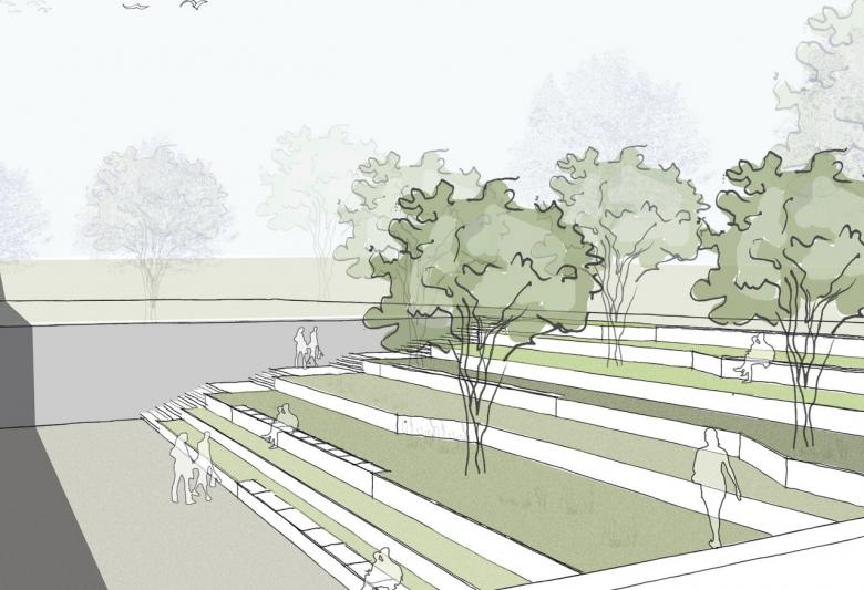 Der rückseitig des Neubaus liegende Freiraum wird durch den terrassierten Gartenhof geprägt. Durch die im Untergeschoss liegende Nutzung als Veranstaltungs- und Sozialraum vorgegeben, wird der Gartenhof als grüne Erweiterung des Gebäudes angelegt. Seitlich durch zwei geschosshohe Ortbetonwände mit davorliegenden Stufen- und Wegeanlagen gefasst, terrassiert sich der Freiraum in ca. 50 cm hohen Stufen auf die Höhe des 1. Untergeschoss herab. Am Gebäude bietet eine Terrassenfläche aus großformatigen Betonplatten die Möglichkeit zum Aufenthalt im Freien. Die Grünen Terrassen werden als Rasenflächen und in Teilbereichen als Pflanzflächen mit Gräser- und Staudenpflanzung angelegt und von mehrstämmigen Kirschen überstanden.