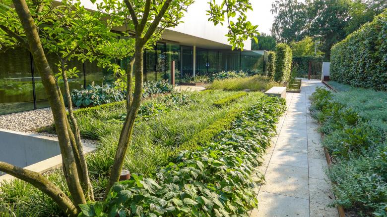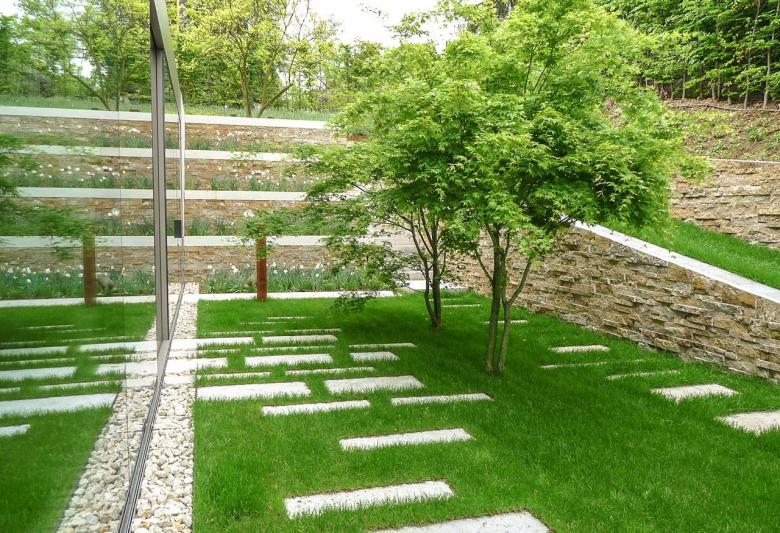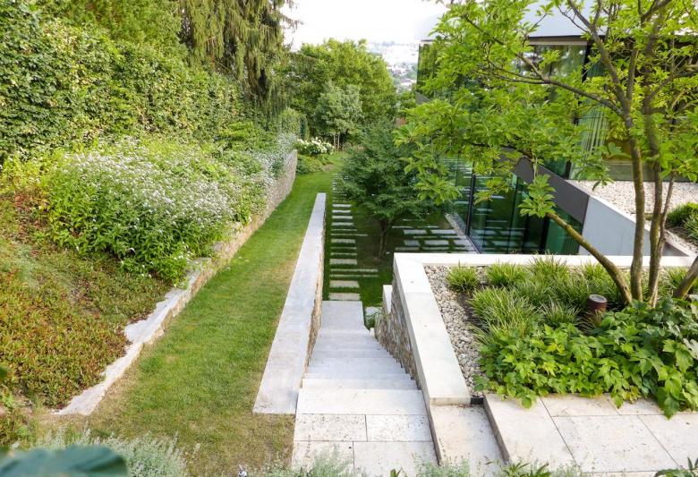 Der Blick öffnet sich nach Süden über das Tal bis zur nahen Stadt. Weinberge folgen dem Hang bis zu seinem Fuß. Eine großzügig modellierte Rasenfläche wird im unteren Teil des Gartens angehoben und zu einer Spielwiese entwickelt. Terrassen und ein Patio bieten gebäudenahe Aufenthaltsflächen und schaffen den Übergang zum Gartengeschoss des Hauses. Ein langes Wasserbecken führt zum Eingang des Hauses und schafft eine hohe Qualität für das Entrée.