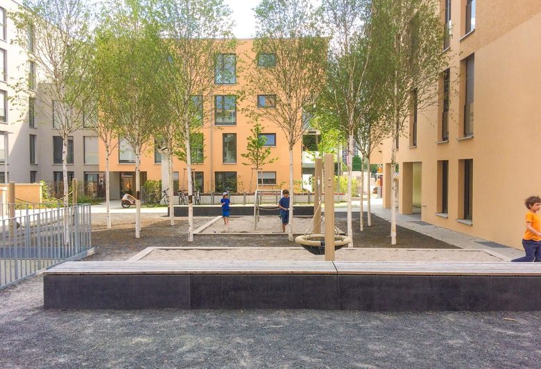Zentraler Treffpunkt im Quartier ist eine große Platzfläche. Ein Birkenhain überstellt den wassergebundenen Platz mit integrierten Spielgeräten und Aufenthaltsbereichen. Lineares und prägnantes Gliederungselement der grünen Mitte ist das skulptural gestaltete Sitzelement, das die Entlüftung der Tiefgarage integriert. Den Übergang zwischen den beiden Bauabschnitten markiert die Landschaftstreppe mit größerer Spielstation im südlichen Bereich des Quartiers.
