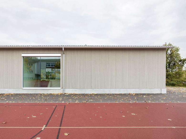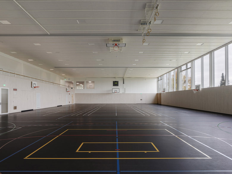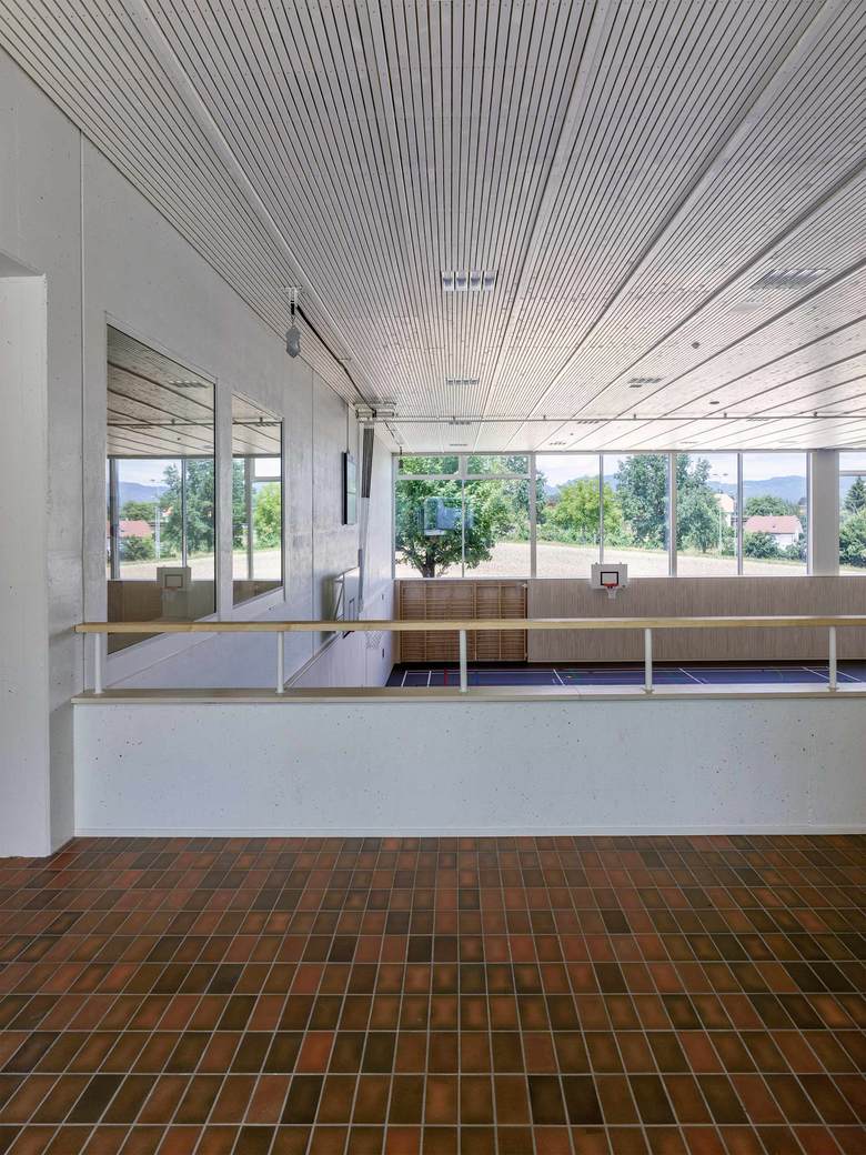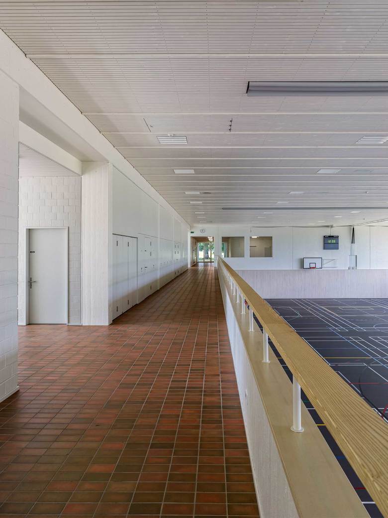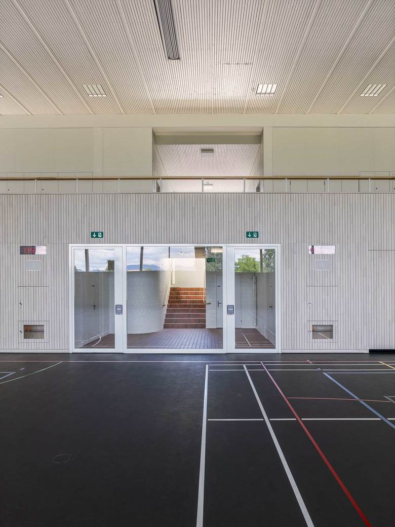 Nach dem Umbau kontrastieren grosse Glasflächen die präzise ausgeführte Holzfassade, die mit einem feinen silbrigen Wellblechdach kombiniert wurde. Im Hallenraum schaffen die weiss gestrichenen Betonflächen zusammen mit dem hellen Holz und dem dunkelgrauen Sportboden eine lichtdurchflutete Atmosphäre. Die Bausubstanz wurde soweit wie möglich belassen. Einzig der Mehrzweckraum mit anschliessendem Office sowie das Lehrerzimmer machten grössere strukturelle Eingriffe nötig.