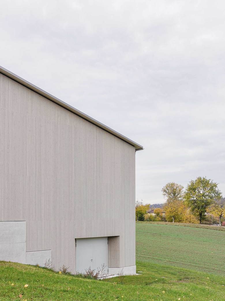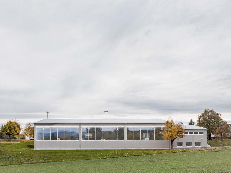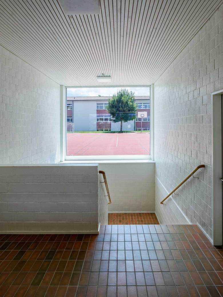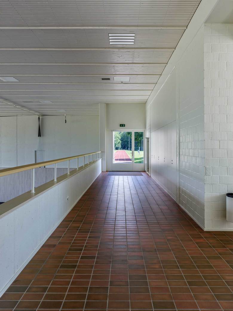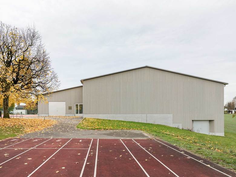 Nach dem Umbau kontrastieren grosse Glasflächen die präzise ausgeführte Holzfassade, die mit einem feinen silbrigen Wellblechdach kombiniert wurde. Im Hallenraum schaffen die weiss gestrichenen Betonflächen zusammen mit dem hellen Holz und dem dunkelgrauen Sportboden eine lichtdurchflutete Atmosphäre. Die Bausubstanz wurde soweit wie möglich belassen. Einzig der Mehrzweckraum mit anschliessendem Office sowie das Lehrerzimmer machten grössere strukturelle Eingriffe nötig.