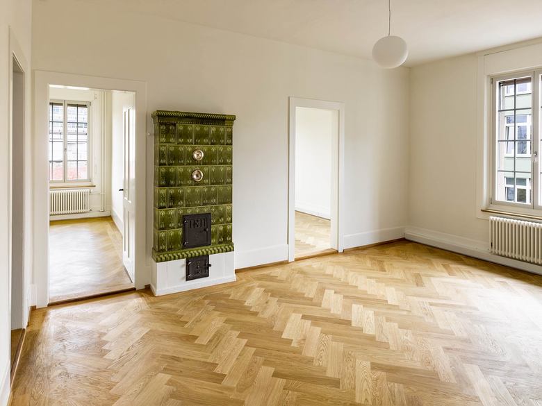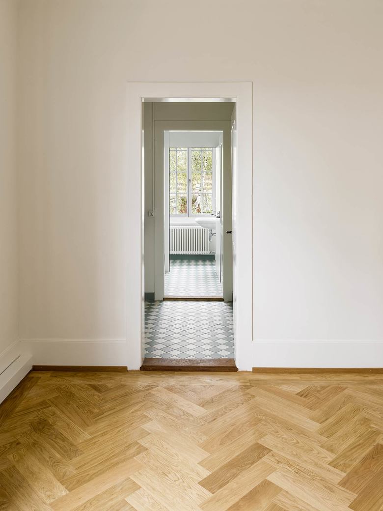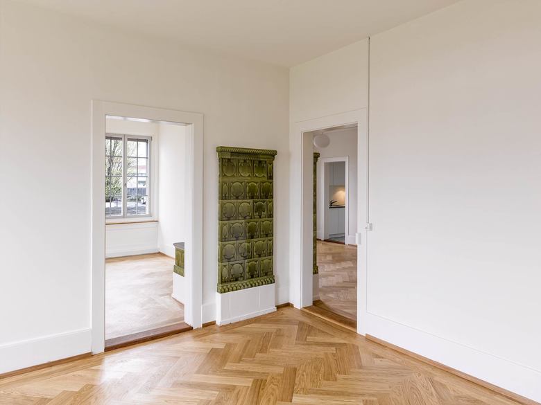 In einem ersten Schritt wurden nicht zum originalen Ausbau gehörende Elemente entfernt und die Innenräume und Fenster ursprungsgetreu wiederhergestellt. Ein neuer Fischgrätparkett aus Eiche wurde in allen Haupträumen verwendet und schafft eine gehobene Atmosphäre. In Bad und Küche ergänzen die schlichten hellen Einbauten und ein dunkelgrün-weiss karierter Fliesenboden den Bestand.
