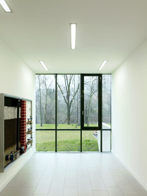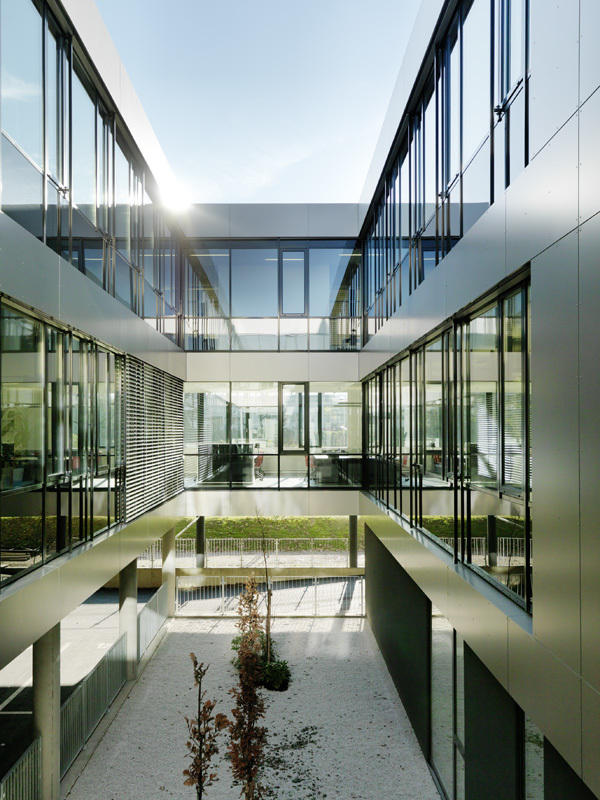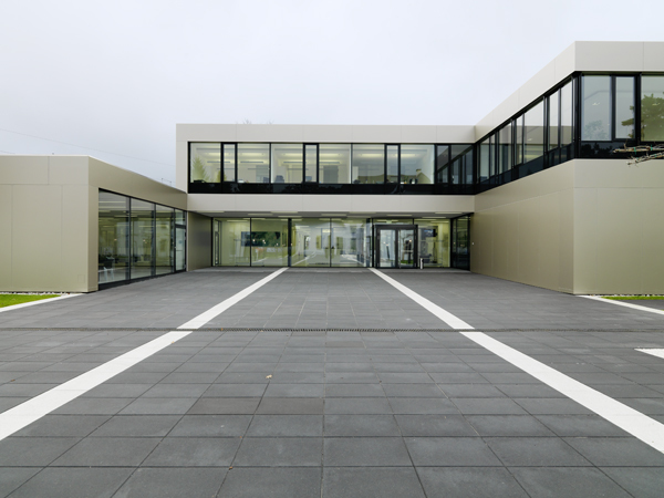 Situated in the midst of industrial, commercial and residential block buildings, the contrast with the surroundings visualises those qualities held to be synonymous with the subject of water – specifically drinking water. Thanks to its location, the new building complex forms a unit with the existing operational and workshop buildings, connected by a generous and yet inviting square available for a variety of different uses. The access situation to the premises is essentially unchanged, the straight path continues to stand for an open-armed reception at the Andritz site. Accompanied by attractive landscaping are the 100 parking spaces for visitors and staff and the driveway to the 50 covered parking spaces below the new building. The building concept is based on the idea of creating a harmonious ensemble with the existing complex by following its building lines. The functional areas of the two-storey operational building and the single-storey laboratory wing are combined in a compact structure positioned at the edge of the site in order to lend an aspect of lightness and floating to the whole. In addition to a clear-cut definition of the square-side main entrance, the laboratory is also given separate access, and thus not only retains its independence and function, but also, being aligned to the car park, contributes to a clear arrangement for customers. A key aspect of the floor plan concept is the layout of the event hall, that is inserted between the laboratory and operational areas. This ensures that the unit can both operate autonomously and also that adjoining areas can be connected as required. A flexible use of space and the interplay of inside and outside – with the aid of open and closed atria – create the ideal conditions for a pleasant indoor and working atmosphere and reflect a modern corporate philosophy.