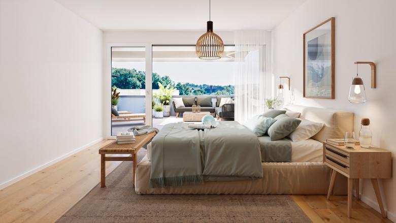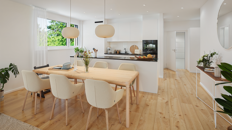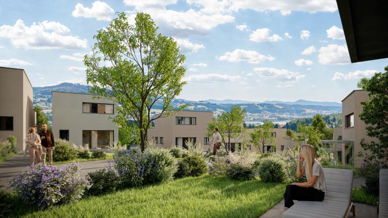 Die Einfamilienhäuser sind in zwei Typen mit je individuellem Wohnangebot gegliedert – wobei alle Häuser über eine grosszügige Dachterrasse im Attikageschoss, einen Garten im Erdgeschoss und eine eigene Doppelgarage verfügen. Je nach Haustyp liegen die Wohnräume entweder auf dem Erdgeschoss mit direkter Anbindung zu Sitzplatz und Garten oder aber die Wohnräume sind im Attikageschoss angeordnet und öffnen sich hin zur Dachterrasse mit ihrem spektakulären Weitblick.