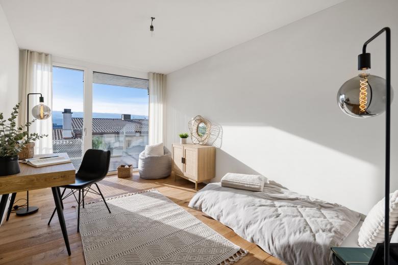 Die Eigentumswohnungen verfügen über grosszügige Schlafzimmer sowie wohlproportionierte, offene Wohn-und Essbereiche. Die angrenzenden Balkone bzw. Terrassen sorgen für viel Licht im Innern und zusätzlichen Raum zum Geniessen und Verweilen im Freien. Die Wohnungen mit Erdgeschossbezug verfügen über grosse Gartensitzplätze.