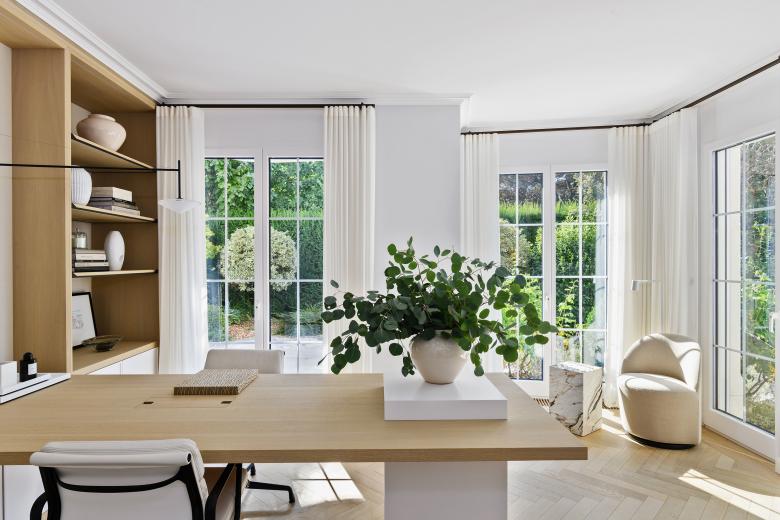 The sunlit office features two spacious workstations with custom furniture that offers ample storage and hidden electrical plugs at the center of each desk, keeping cables out of sight. The design blends functionality and style, creating a refined, efficient workspace.