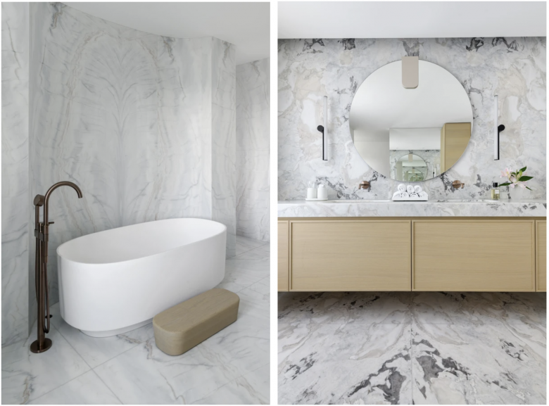 The bathrooms received the biggest transformation, where each room had a different colored marble hand selected.