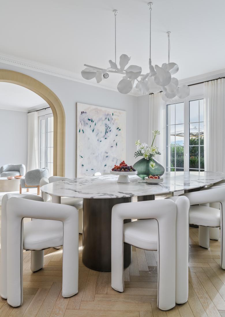 The Moonpapier pendant light by Olga Engel makes a bold statement with its simplicity, complementing the organic marble table and curved dining chairs. Asian-inspired cabinets add a final touch to the room.