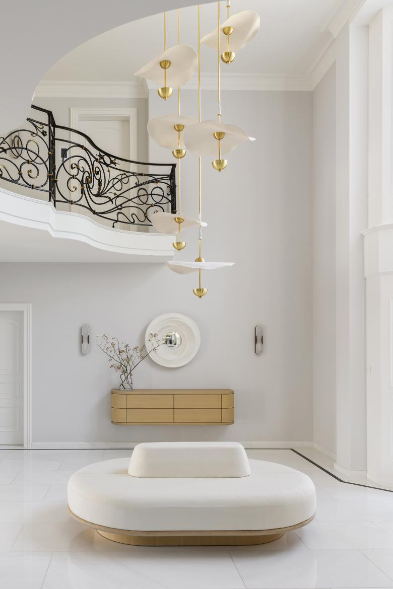 The double height entry hall creates an immediate balance of grandeur and minimalistic elegance. The centrepiece of this foyer is an elegant chandelier made of porcelain by the Parisian design studio Mydriaz. Quietly sitting below are an oval ottoman and wood, sideboard table, both custom designed by our team.
