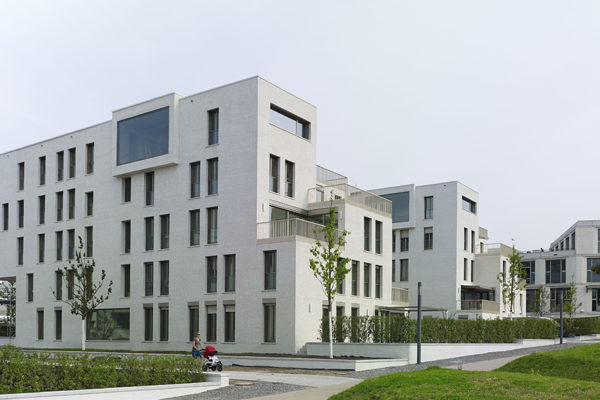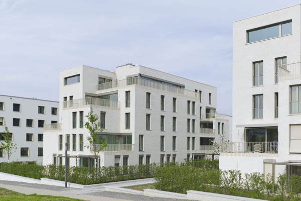 Die drei unterschiedlich positionierten und skulptural gestalteten Terrassenhäuser spannen einen qualitätsvollen, grosszügigen halbprivaten Aussenraum zwischen sich auf und bieten immer wieder Aus- und Durchblicke auf die umliegende Parklandschaft. Diese Differenzierung der Volumen erlaubt Individualisierung und Identifikation für die Eigentümer. Das Konzept bietet verschiedenartige Wohnungstypen, vom klassischen Grundriss bis hin zu offenen Raumfolgen. Jede Wohnung ist dreiseitig belichtet und hat direkten Sichtbezug zum Park. Im Außenraum entsteht durch Höhenstaffelung des Geländes eine Gliederung in öffentliche Erschließungsbereiche, halböffentliche Aufenthaltszonen und private Außenräume. Terrassen und Gärten bilden einen fließenden Übergang von innen nach außen. Innerhalb des Ensembles entstehen immer wieder Durchsichten auf die umliegende Parklandschaft.