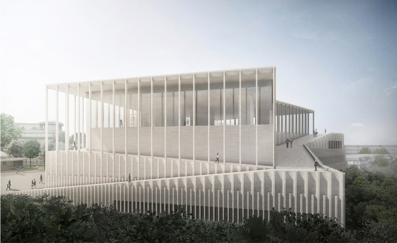 Durch die umlaufenden Rampen wird der Baukörper gegliedert und tritt so in einen differenzierten Dialog mit der heterogenen Maßstäblichkeit der Umgebung. Der Besucher ist eingeladen, seinen Weg in das Gebäude fortzusetzen und wird durch die verschiedenen Ausstellungsräume zurück auf das Straßenniveau geführt. Anschließend kann der Weg entlang eines kontemplativen Wasserbeckens zum Denkmal-Garten vor dem Internationalen Zentrum für Kultur und Kunst fortgesetzt werden.