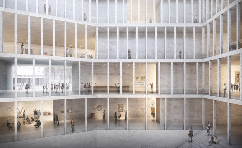 Der für das Museum vorgesehene Ort, gelegen auf einer Anhöhe, gilt als einer der zentralen Orte der „Revolution der Würde“. Der Entwurf für das neue Museumsgebäude auf der Kuppe des Hügels symbolisiert den entscheidenden Moment des Ansturms und transportiert dieses Bild in das Konzept für ein „begehbares Haus“. Gleichzeitig werden dem Nationaldenkmal, welches als Abfolge differenzierter Räume entlang eines gekurvten Pfades angelegt ist, weitere Sequenzen hinzugefügt. Unterschiedlich breite Rampen sind um das Gebäude herum organisiert und zeichnen die Hügelerstürmung in konzentrierter Form nach. Gleichzeitig setzen sie den Weg vom Maidan herauf am Gebäude fort. Dieser mündet von beiden Seiten her in einer Terrasse, welche wiederum einen (reflektierenden) Blick zurück zum Maidan bietet.
