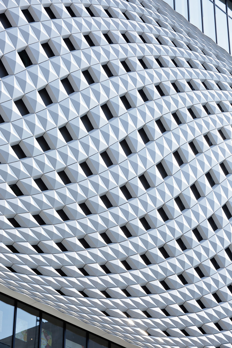 パターンに凹凸をもたせることで、手で包み込みたくなるような手触り感も表現し透かし彫りの白い器のような建築の表情を作り出しました。時間の移ろいとともに人々の行き交う街に様々な表情を投影します。