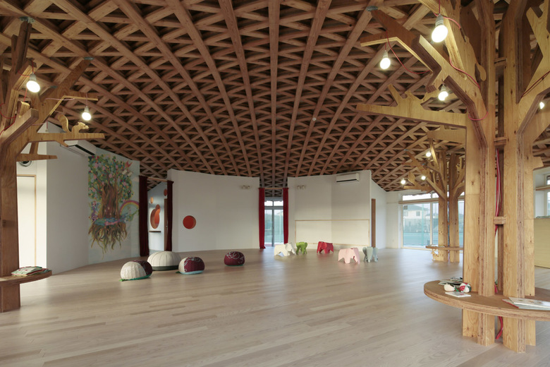 公園の中にひょっこり現れる、紅白ストライプ柄が目を引く建物。まるで麦わら帽子のような屋根の形も、見る者の気分を楽しませる。屋根の内側には断面の小さい木材を編み込んだ構造や、木の形をした柱に動物がいるなど、遊び心のある建築的な仕掛けがたくさんある。