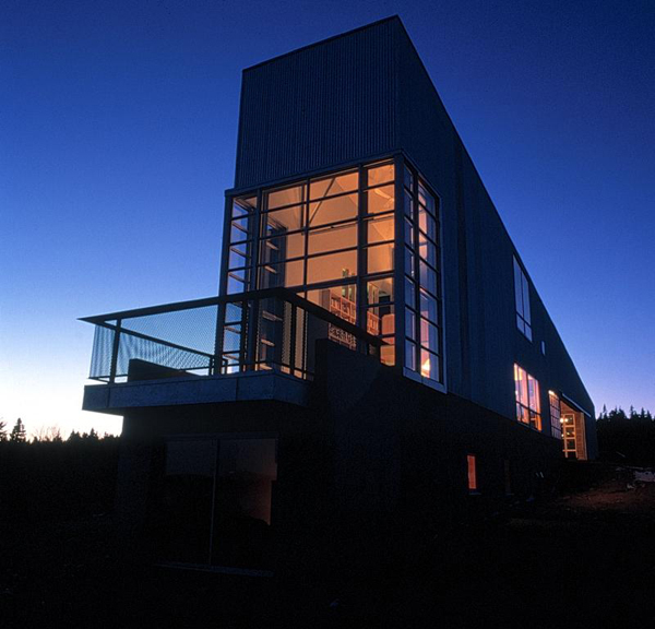 The monolithic, monopitch roof climbs to the south and the water, covering one continuous, unobstructed living space progressing from garage, to entry court, to kitchen, living and cantilevered deck. This tube is punctuated by totemic elements which inflect it and provide comfort and place-making (bridge, well, hearth, truss, south window). The spatial reading of the concrete foundation makes a wainscoting sill in the main living area. Three bedrooms occupy the lower level, while a master bedroom/study occupies a second floor loft. De-laminated walls and ceiling expose conventional platform framing. The house exploits a passive environmental approach to heating and ventilation. It is an essay on the relationship between form and lifestyle, which clearly demonstrates that a 12’ wide wall in the landscape can provide the spatial and functional requirements of modern living.