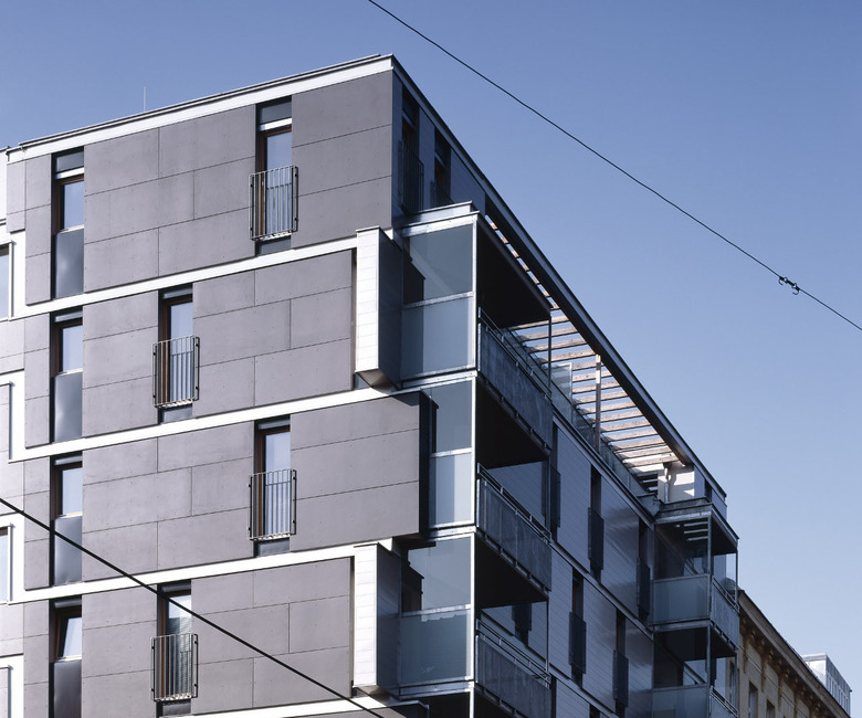 Von außen muss das Gebäude aufgrund des L-förmigen Grundstücks zweierlei leisten: einerseits ein Teil der Platzfront des Mortaraplatzes sein, (hier geben wir dem Bau eine repräsentative Metall und Faserzementfassade) und andererseits die Baulücken der Nebenstraßen schließen (wir verwenden Silikatputz, der sich gut in die Nachbarschaft einfügt).
