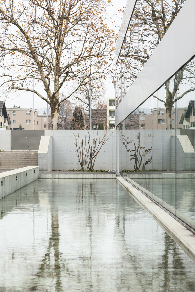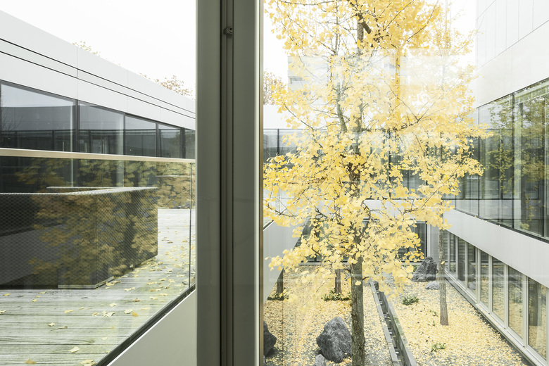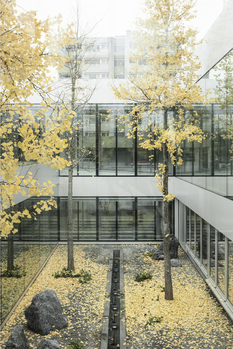 Der Garten zwischen dem Alt- und dem Neubau mit lichtdurchfluteter Kundenzone soll Offenheit und Transparenz vermitteln. Ausgehend von Farnen zwischen dunklen Felsbrocken strebt der schluchtartige Innenhof in vertikaler Ausrichtung über sieben Meter hohe Wasserfontänen und die filigran wirkenden Mädchenhaarbäume dem Himmelblau entgegen. Dieses spiegelt sich wiederum im Wasserbecken vor der Hauptfassade.