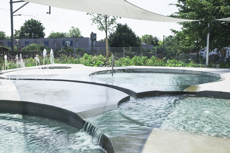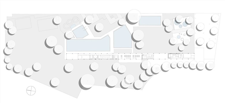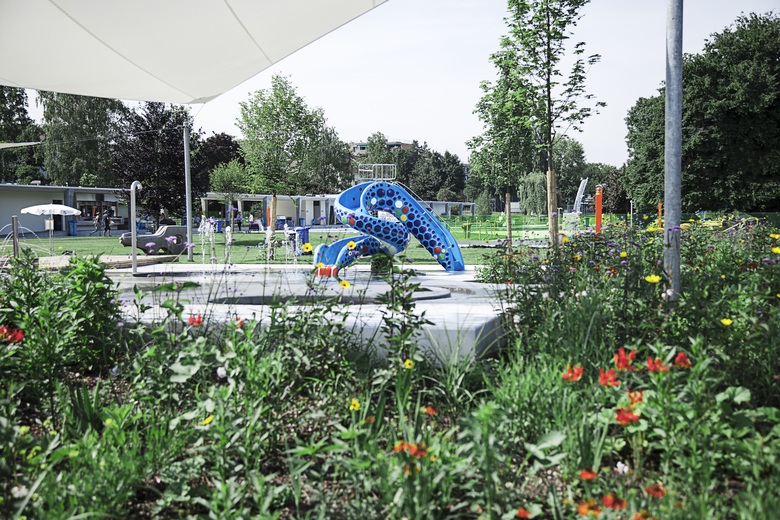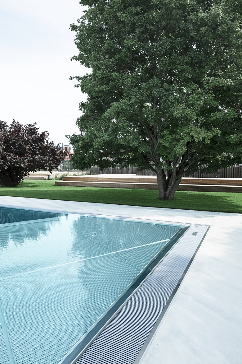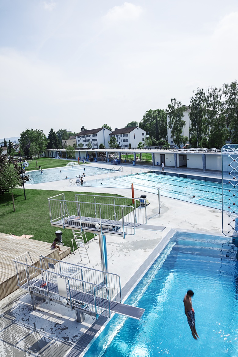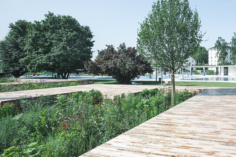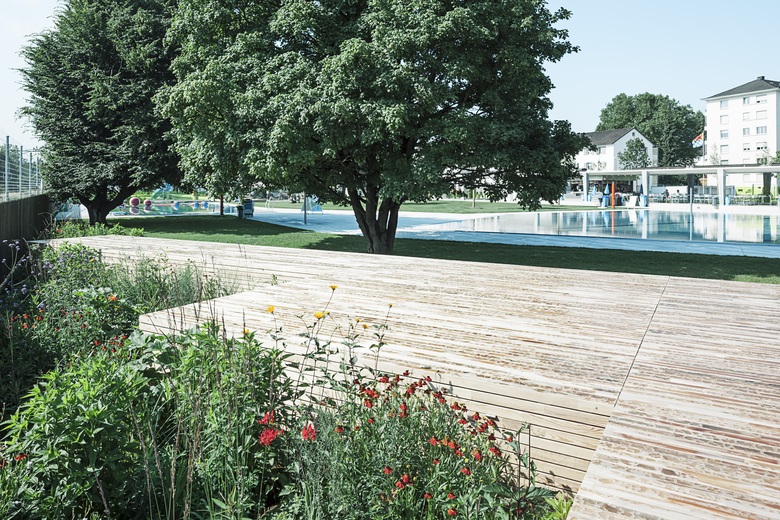 Die Umgestaltung schafft mehr Weite und Grosszügigkeit. Einzelbauten weichen einem durchlässigen Gebäuderiegel. Er strukturiert die Fläche, beruhigt, teilt den Freiraum in eine aktive Badeseite und einen ruhigeren Liege- und Parkteil. Der wertvolle Baumbestand wird integriert und ergänzt. Leicht erhöhte Holzdecks überblicken die Becken und schaffen die Gelegenheit zum «Sehen und gesehen werden».