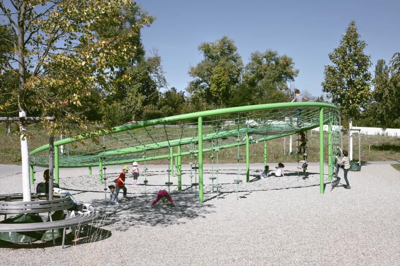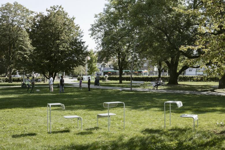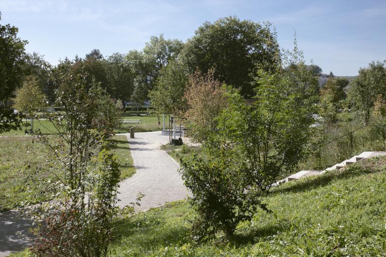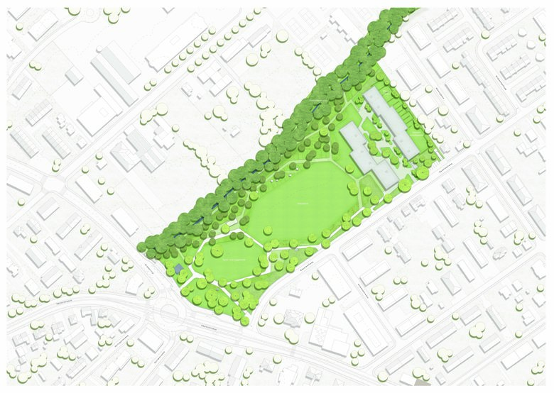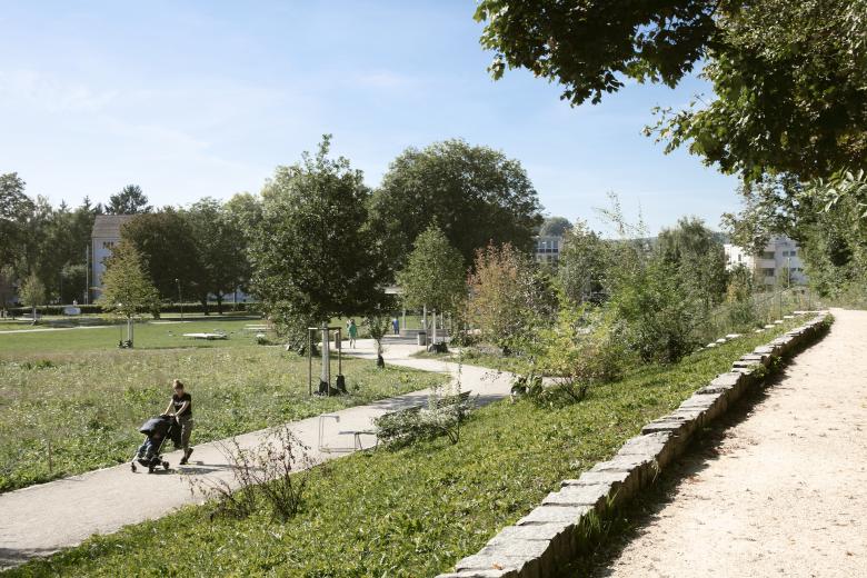 Ein unprätentiöses, unaufgeregtes Projekt, dessen Entwicklungspotential sich erst auf den zweiten Blick offenbart. Bachraum und Dammweg als abfallender Uferbereich werden neu gestaltet. Bisheriger Baumbestand und neue Bepflanzung greifen ineinander. Wegeführung und Bäume formen zwei unterschiedlich grosse Parkwiesen. Der Verkehrsraum der Baslerstrasse erscheint weit weg.