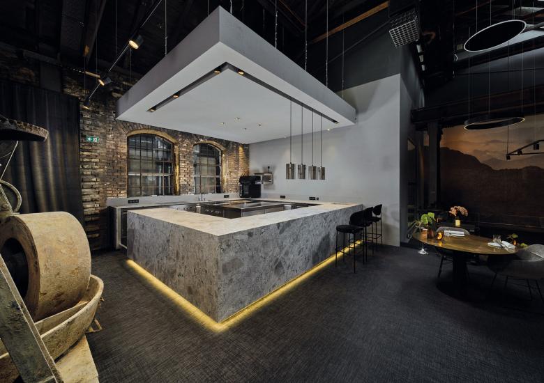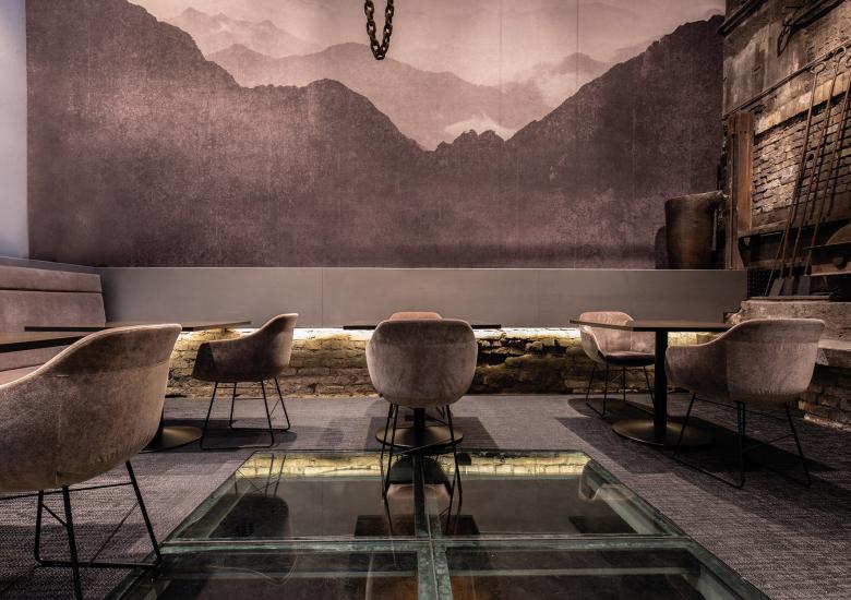Für die Gestaltung war die geschichtsträchtige Umgebung die perfekte Inspiration. Mit gediegenen, hochwertigen Materialien wie Naturstein, Messing, Muranoglas und Velourleder veredelt, trifft nun Eleganz auf moderne Gemütlichkeit. Das innovative Interieur vervollständigt das Genusskonzept auf elegante, entspannte Weise.