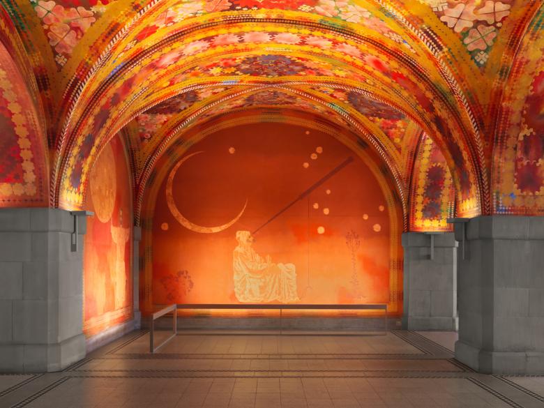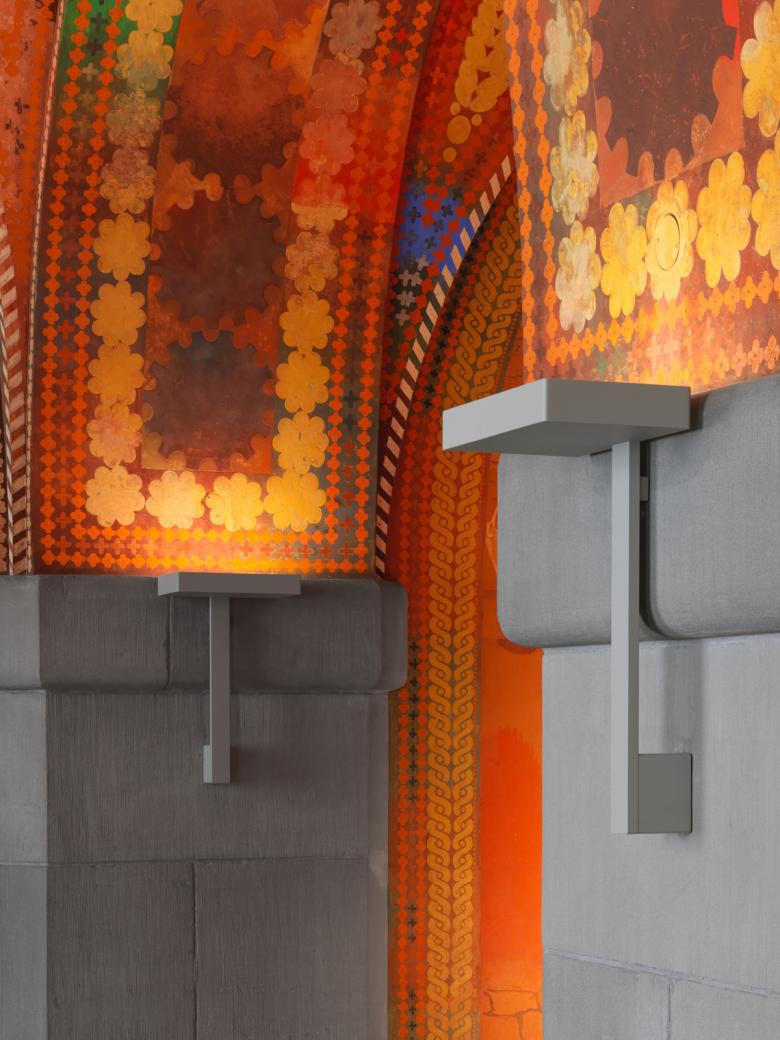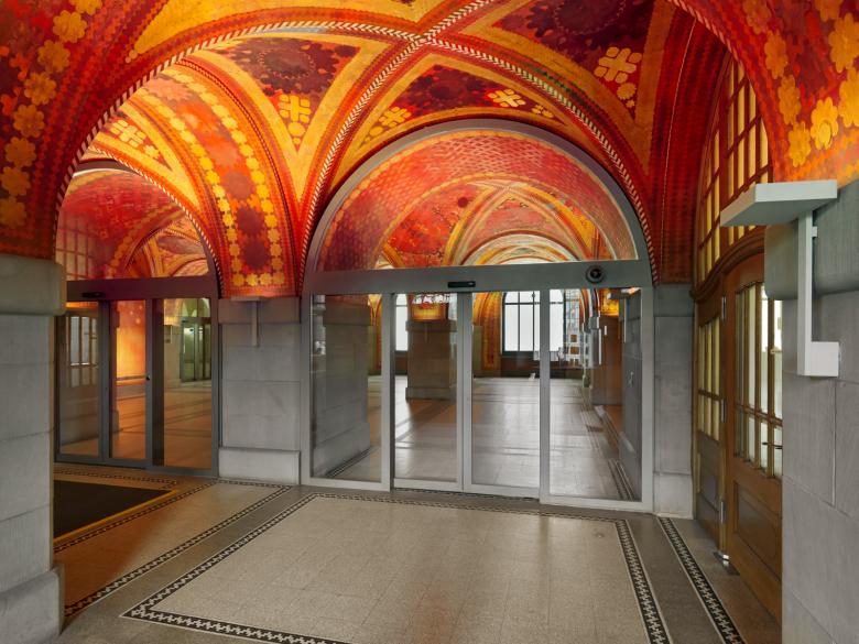 Mit dem Fresko von Augusto Giacometti beherbergt das Amtshaus I eines der bedeutendsten Kunstwerke der Stadt. Im Zuge der Gesamtsanierung wurden wir mit der Konzeption und Planung einer neuen Beleuchtung beauftragt. Wir ersetzten die alten, auffälligen Leuchten mit einer diskreten Beleuchtungslösung. Die Lichtabgabe setzt nun präzise über den Sandsteinsäulen ein und steigert sich sanft bis zum Zenit der Kuppeln. Durch Ermittlung der optimalen Farbtemperatur am Werk und der hervorragenden Farbwiedergabequalität der eingesetzten LEDs, wird die einst als tiefrot empfundene Malerei zu einer ungeahnt frischen, farbigen Welt. Sonderkonstruktionen, wie Abschrankungen mit integrierten Leuchten, welche die vier Wandbilder ausleuchten und hinterleuchtete Fenster ergänzen unsere Interventionen.