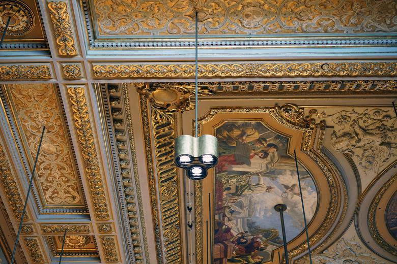 Dieses besondere Projekt begann mit der Teilnahme am Ideenwettbewerb «Neues Bühnenlicht Grosse Tonhalle». Die komplexe Ausgangssituation, wie vorgegebene Positionen, das limitierte Leuchten-Gewicht, die Vermeidung jeglicher Blendung und die Anforderrungen an eine lichtstarke, homogene Ausleuchtung der gesamten Bühne, stellten uns vor eine grosse Herausforderung. Die gestalterischen Einschränkungen und die hohen Ansprüche machten wir zu den Leitelementen unseres Entwurfs - wir gewannen den Wettbewerb. Die Leuchte besteht aus drei Lichtquellen, drei technische Elemente, die verstellbar sind und je nach Position unterschiedliche Ausstrahlungswinkel besitzen. Sie sind von einer geschwungenen Platte aus eloxiertem Aluminium eingefasst, bilden eine schlichte, jedoch elegante Leuchtenform. Durch die konstruktive Einfachheit wird das Gewicht der Leuchte erheblich reduziert. Das Endergebnis ist eine homogen beleuchtete Bühne mit überdurchschnittlich hohen Beleuchtungsstärken auf der Oberfläche der Notenständer und ein ausgewogenes Deckenbild, in dem sich die neuen Leuchten diskret in ihre historische Umgebung einfügen.