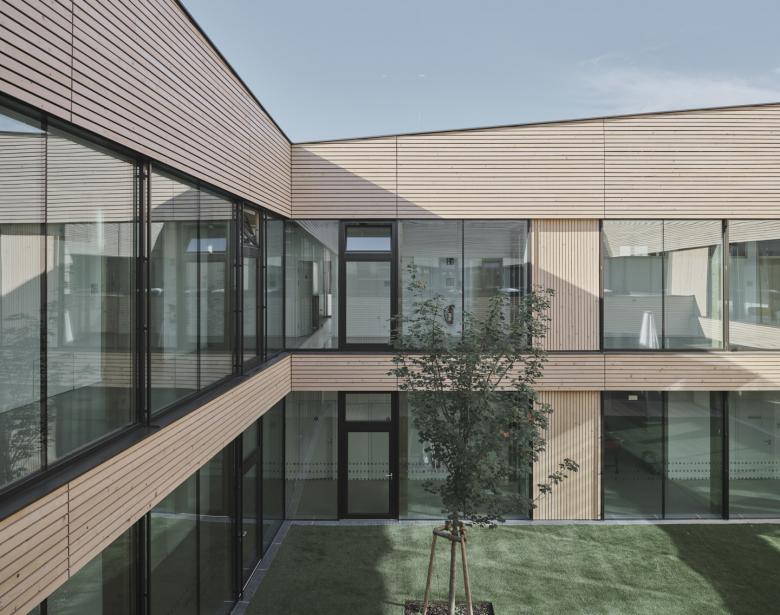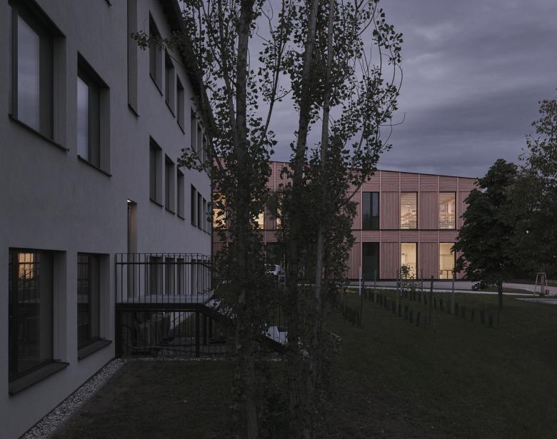 Der Bestandsbau wird im Norden um ein Hofgebäude erweitert. Die Lösung im Umgang mit der topographischen