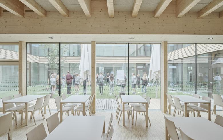 Der Neubau wird barrierefrei erschlossen und löst mit einem Stiegenhauskern geschickt die Split-Level-Anbindung an den Altbau. Die funktionelle Gliederung des Um- und Zubaus besticht durch seine klare Einfachheit und trägt so zu einer guten Orientierung im Gebäude bei. Die Anordnung des Schulrestaurants im Innenhof stellt einen zentralen Mittelpunkt der Schule dar, die das tägliche Leben einer HLT repräsentiert.