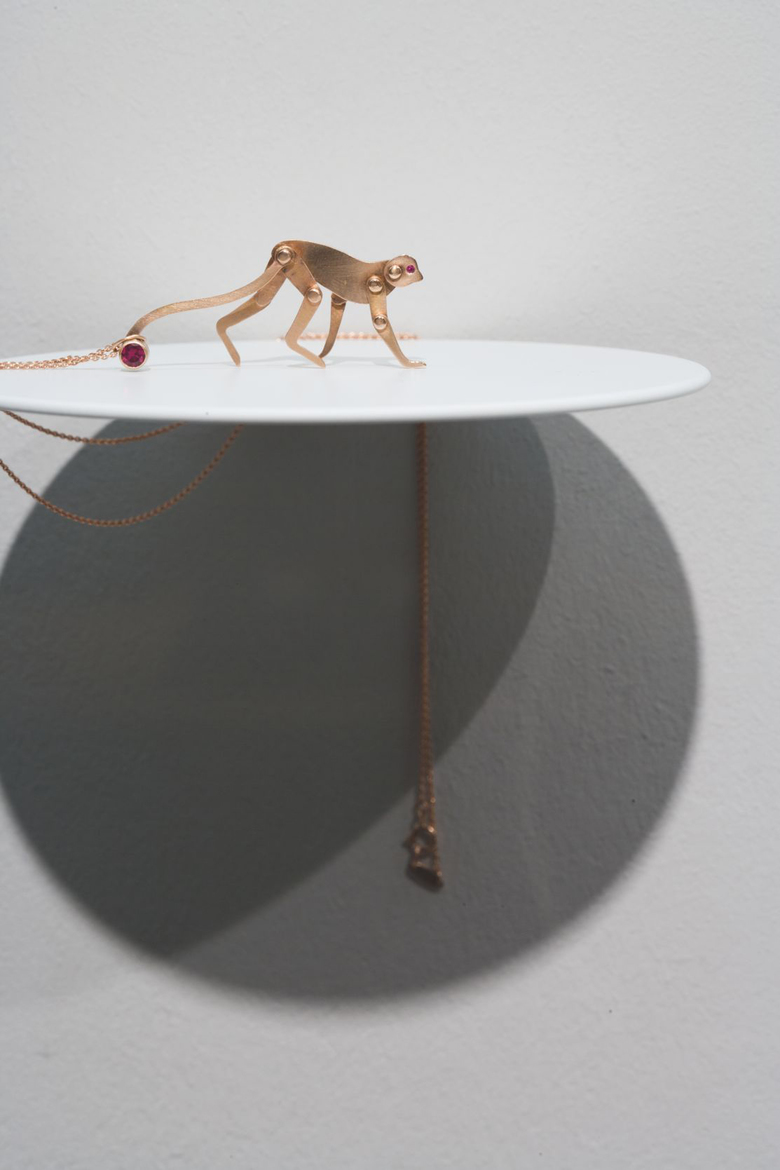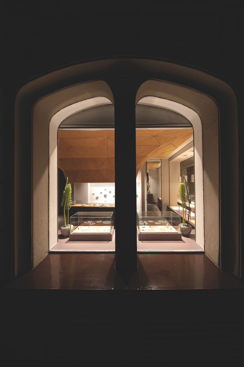 Ein kleiner Raum in allerbester Lage im Zentrum Münchens wird zum Altarraum für exquisiten Schmuck aus aller Welt. Eine Inszenierung musste her, eine Umkehr der Sehgewohnheiten, eine große Geste, die alles zentriert und den Fokus des Besuchers auf den Schmuck lenkt.
