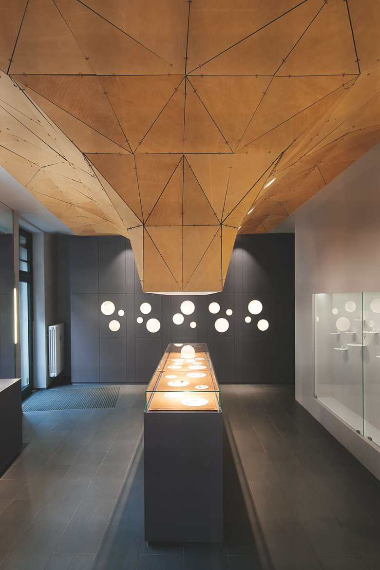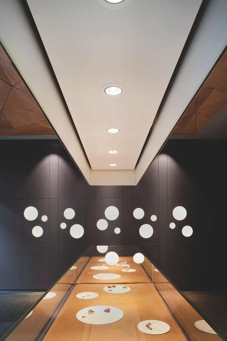 Die Umgebung nimmt sich zurück in Grautönen, während die Schmuckstücke in hell erleuchteten Wandvitrinen präsentiert werden. Die runden Ausschnitte in der Wand sowie die Plates in der Vitrine focusieren auf die Preziosen und spielen mit der Strenge des Interieurs.