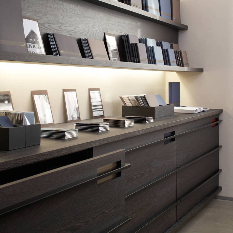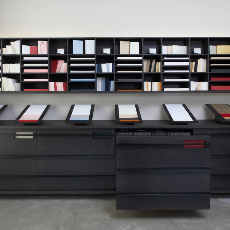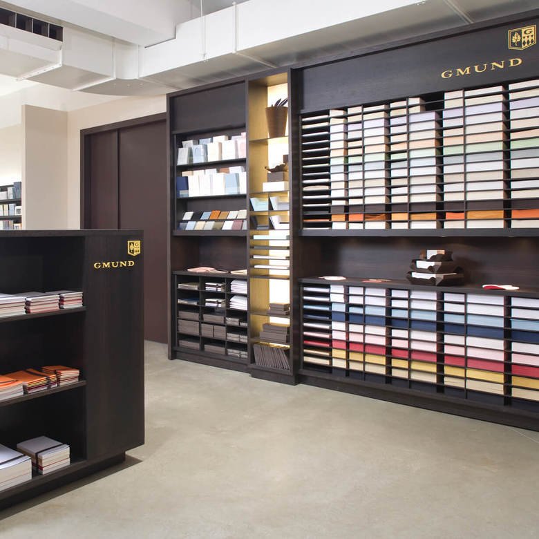 Grund genug für die Büttenpapierfabrik Gmund ein eigenes Shopkonzept zur Präsentation der hochwertigen Produkte entwickeln zu lassen. Diverse modulare Displays wurden entworfen, die je nach Anspruch und Produktsortiment der Shops miteinander kombiniert werden. Edles Mooreichenholz und eine schlichte Formgebung schaffen den eleganten Rahmen für die exquisiten Papiere in verschiedenen Farben und Formaten.
