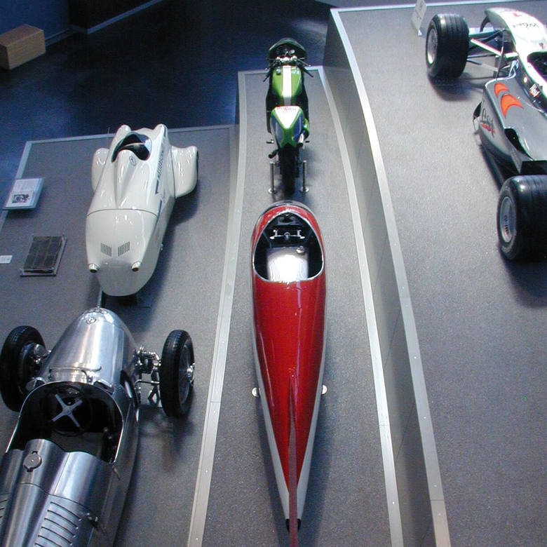 Halle 3 „Mobilität und Technik“ – Das weltbekannte Deutsche Museum hat sich erweitert und die denkmalgeschützten Hallen der alten Messe bezogen. Für die Ausstellungsgestaltung wurde ein Parcours auf zwei Ebenen entwickelt, der die Halle großzügig erschließt und auf verschiedenen Niveaus die Geschichte der Mobilität, vom Fußabdruck bis hin zum Rennwagen, nahe bringt. Die technische Anmutung der Einbauten betont die Exponate und die Mechanik, die stets hinter dem Antrieb steckt, schneller zu sein.