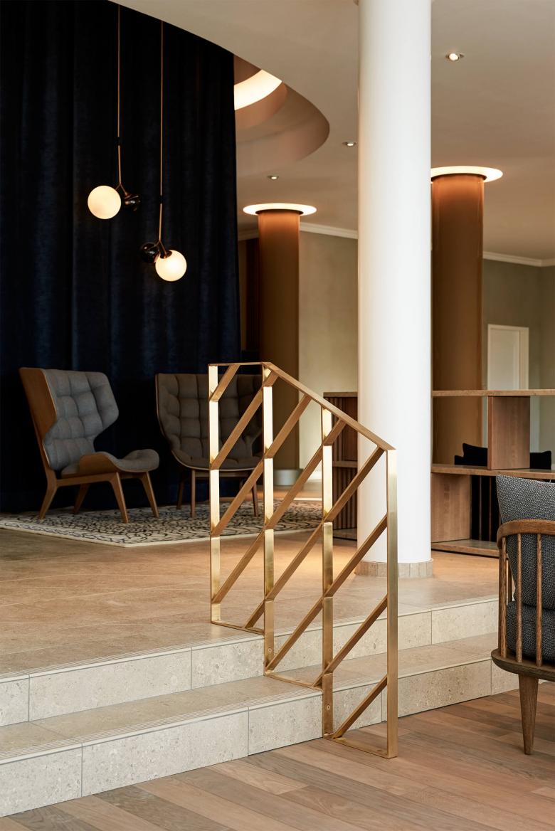 Der Farb- und Materialmix stellt dem Dunkelblau noch ein Grau und ein dunkles Terracotta zur Seite. Diese Farben finden sich in der individuell gestalteten Tapete ebenso, wie in den Wandfarben und losen Teppichen. Natürlich fehlen nicht die messingfarbenen Details, die dem Ländlichen eine elegante Note verleihen. Gold schimmernde Metallvorhänge verkleiden die Säulen, Objektleuchten und Seilgarderoben glänzen in Messing und ein goldenes Deckenfeld in der Mitte des 2-geschossigen Foyers strahlt warmes Licht aus.
