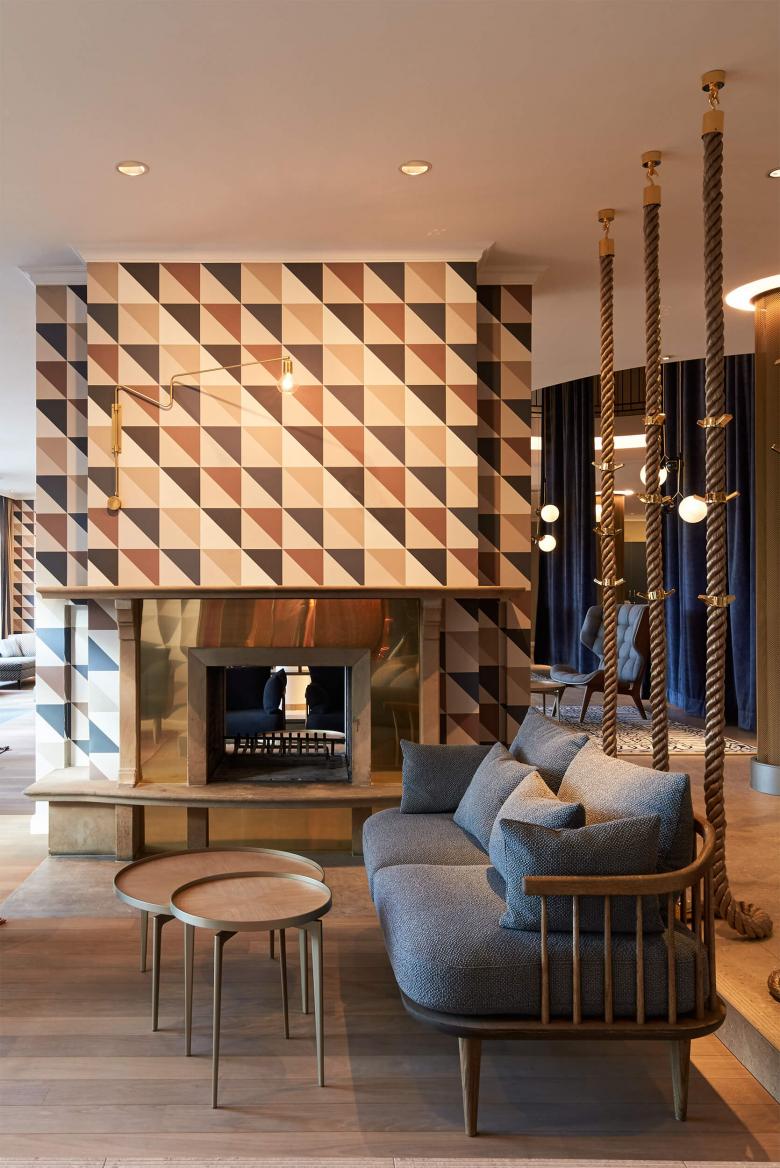 Der erste Eindruck zählt: Beim Betreten der Lobby öffnet sich ein 6m langer, dunkelblauer Samtvorhang und gibt den Ausblick frei auf das Golf-Green der Hotelanlage. Davor empfangen Chaiselonguen die Gäste, dahinter gruppieren sich Sessel und Sofas um den offenen Kamin. Living Lobby, das Wohnzimmer des Hauses, wird zum Treffpunkt für Hotelgäste, Bar- und Restaurantbesucher. Das Einchecken findet an großen rustikalen Tischen mit komfortablen blauen Samtsesseln statt.