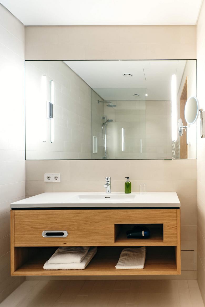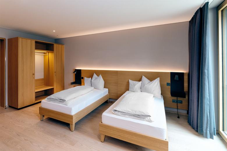 Der Gartensaal der Küferei liegt am östlichen Rand des Geländes und schließt mit seiner öffnenden Geste die Parklandschaft ab. Er wirkt wie eine Bühne eines natürlichen Amphitheaters. Dies erklärt auch die Widmung der Farb- und Materialgebung für den Saal. Zum Bodenbelag der hellbeigen Solnhofer Natursteinplatten und den in Eiche Natur gehaltenen Trennwänden kann die Fensterfront mit raumhohen Dimout-Vorhängen in drei aufeinander abgestimmten Grüntönen verdunkelt werden. Die maximal flexible Konferenzmöbelierung erlaubt ein schnelles und unkompliziertes Bestuhlen für Vorträge, Konzerte und Konferenzen. Das Schwäbische Bildungszentrum erhält 19 neue Gästezimmer auf topaktuellem Hotelniveau in der Vier-Sterne-Kategorie, jedoch gestalterisch reduziert auf die Haltung eines klösterlichen Herbergsgedanken. Die „Entbehrungen“ betreffen in keiner Weise den Komfort der neuen Räume, jedoch nehmen sich die Zimmer im Bezug auf Gestaltungs- und Designvielfalt zurück. Die acht Doppel-, sieben Einzel- und vier barrierefreien Zimmer leben von der Klarheit der Formensprache und der Verwendung weniger, aber natürlichen Materialien. Die klare Linienführung bei der Gestaltung der Schreinermöbel wird durch indirekte Beleuchtungselemente in den Möbeln unterstrichen. Die fein nuancierten, abgetönten Wandfarben und die raumhohen textilen Vorhänge reagieren auf die beiden unterschiedlichen Etagen und den leicht veränderten Lichteinfall.