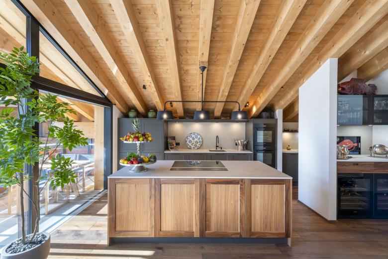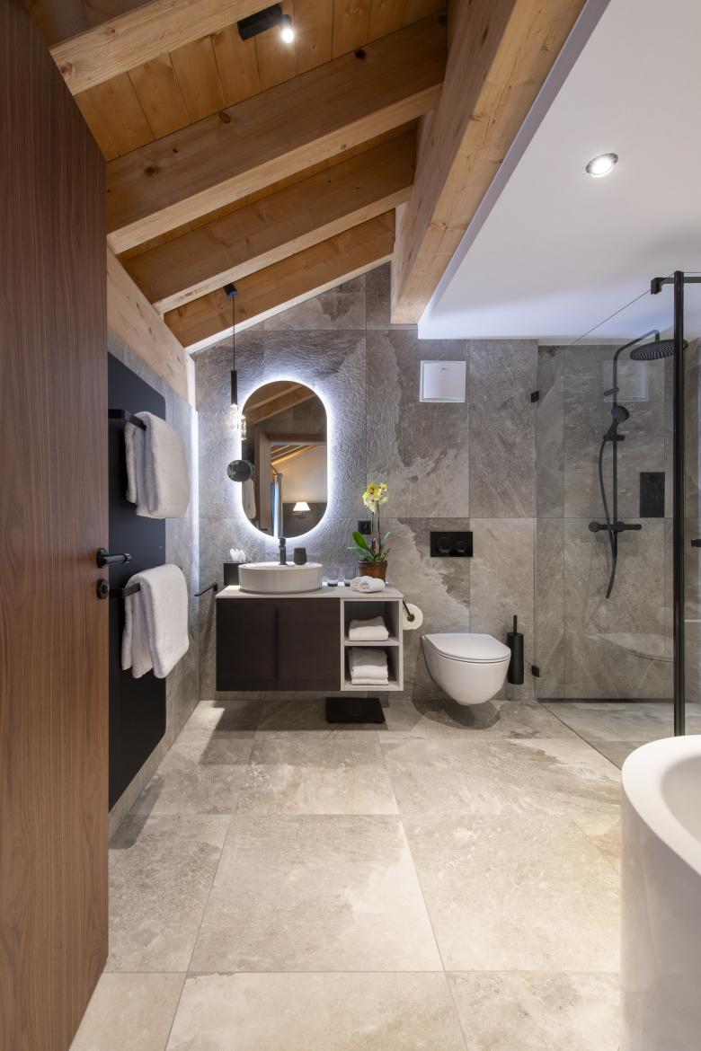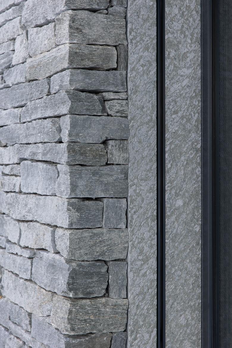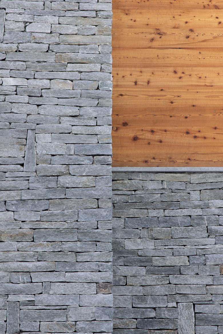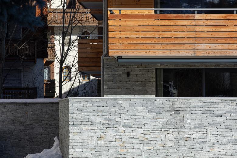 Die Fassadenkonstruktion setzt sich aus der klassischen Kombination von Bruchsteinmauerwerk und Holzverkleidungen zusammen. Grossformatige Verglasungen maximieren den Tageslichteinfall und schaffen Sichtbezüge zur Umgebung. Die Balkone sind geschlossen ausgeführt und folgen einer klaren, quadratischen Geometrie welche zu ruhigen Linien in den Fassaden führt.