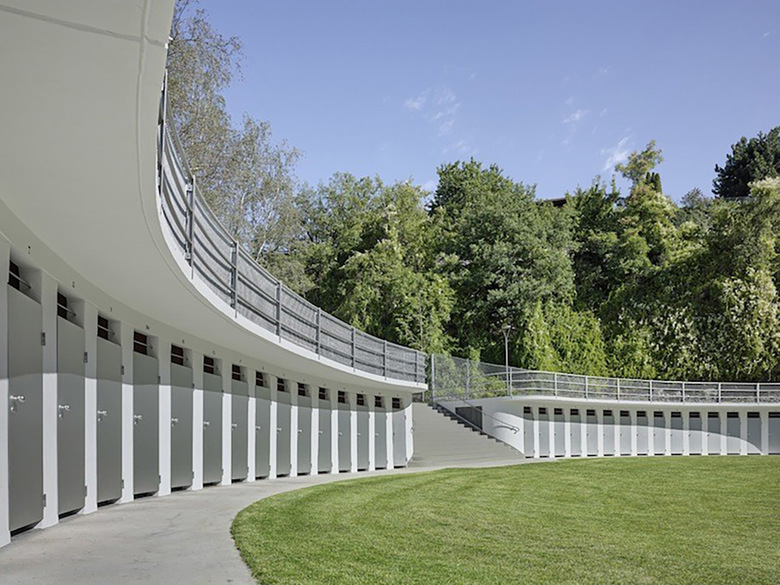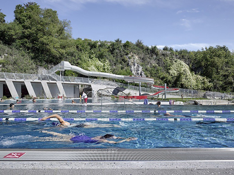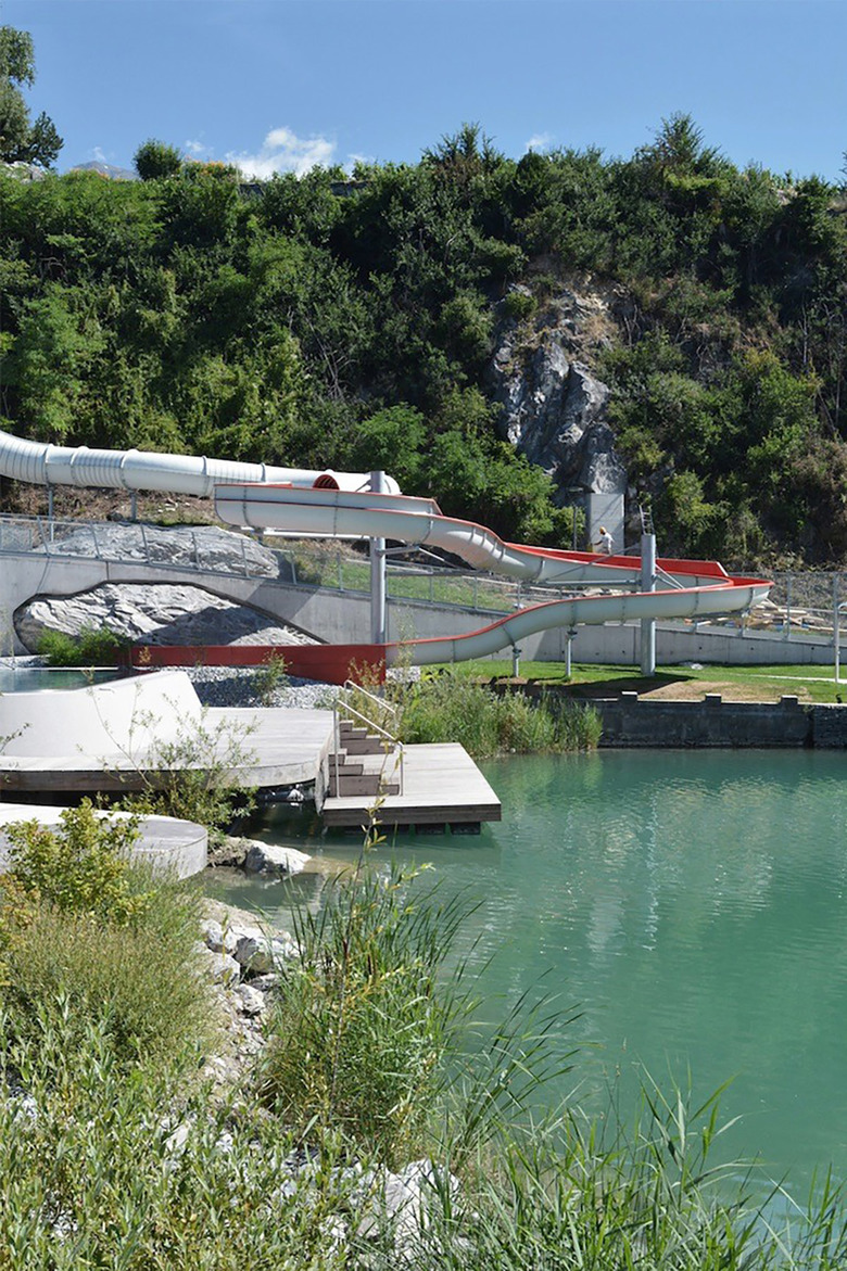 Mit den Holzflossen und dem mit einheimischen Pflanzenarten renaturierten Ufer wird ein sanfter Übergang zur Seeoberfläche geschaffen. Die modernistische Anlage wird sorgfältig saniert, ihre Wirkung wird verstärkt. Die Materialpalette beschränkt sich auf Beton, Aluminium und Holz als zeitgenössisches Pendant zur historischen Substanz. Die Heizung des Badewassers wird durch eine Wärmepumpe mit dem Seewasser erzeugt. Der Pioniergeist der Sportarchitektur der Moderne prägt die sanfte, nachhaltige Erweiterung und rückt den malerischen Standort von Géronde wieder in den Vordergrund.