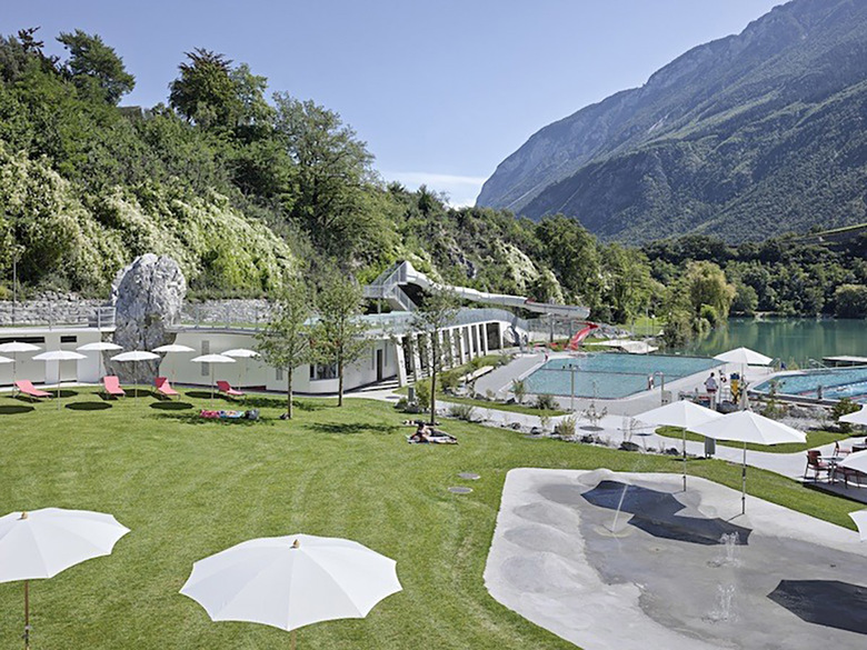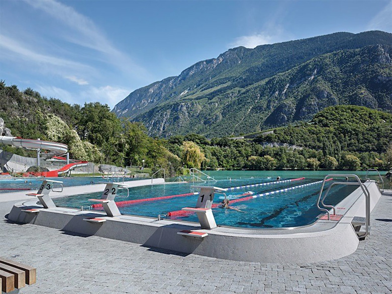 Im Sinne der alten Postkarten der Simplonlinie schlägt die nachhaltige Erneuerung der denkmalgeschützten Badeanlage von Géronde und eine Verstärkung des Bezugs zum See vor. Das halbkreisförmige Garderobengebäude wird am Eingang sowie am nordöstlichen Hang als Promenade entlang der Felsen erweitert und schafft somit eine landschaftliche Lösung für die Vollendung des Seerundganges. Die neu entstehenden Terrassen ermöglichen die harmonische Integration des Raumprogramms. Die neuen Edelstahlbecken schweben leicht über dem Seespiegel, sodass der Badegast einen uneingeschränkten Blick auf die Berglandschaft geniessen kann.