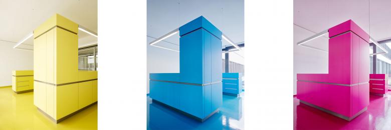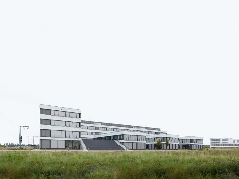 Freiham ist immer wieder unsere Baustelle. 2012 zog es uns abermals dorthin. Dieses Mal bauten wir dort die 18.000 m2 Fläche umfassende Firmenzentrale des US-amerikanischen Medizintechnikunternehmens Arthrex. Dieser Globalplayer hatte einen Wunsch: Er wollte eine Architektur, die alle Mitarbeiter seiner europäischen Hauptniederlassung aufnehmen kann. Soviel vorweg: Unser Arthrex-Bau vis-à-vis des dunklen, schwarzen Werkraumwest ist hell, vor allem an sonnigen Tagen, wenn der Lichtschutz im Einsatz ist. So entstand ein kontrastreicher Dialog zwischen zwei unserer Bauten am Ort.